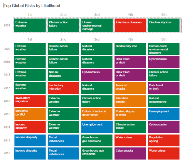 En el darrer informe que ha emès el Fòrum Econòmic Mundial aquest mes de gener de 2021 s’assenyala el canvi climàtic i la pèrdua de biodiversitat com els dos riscos globals més importants als quals no s’està donant una resposta adequada. Els segueixen dos riscos socials - l’erosió de la cohesió social i la desil·lusió del jovent- i un de tecnològic - els efectes adversos associats a noves tecnologies.
