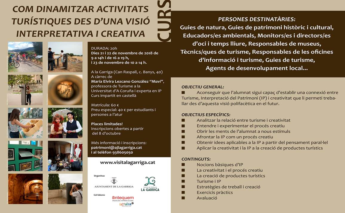 Des de l’Ajuntament de la Garriga tornem a organitzar un curs per aprofundir en un nou aspecte de la Interpretació del Patrimoni. En aquest cas és un curs de formació que parla de la utilitat de vincular la Interpretació del Patrimoni i la creativitat en la gestació i creació de propostes turístiques.