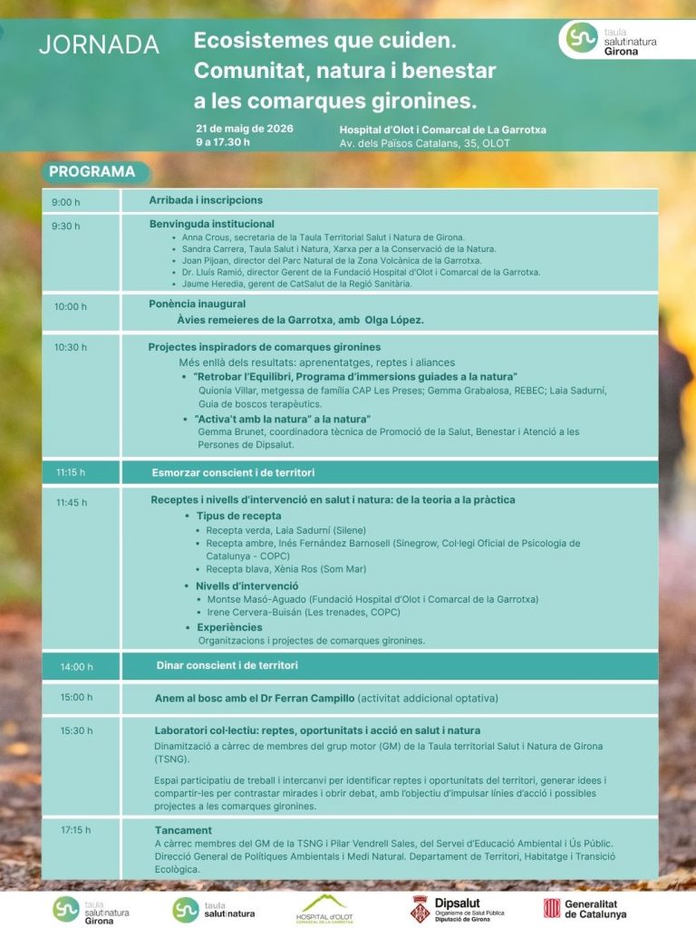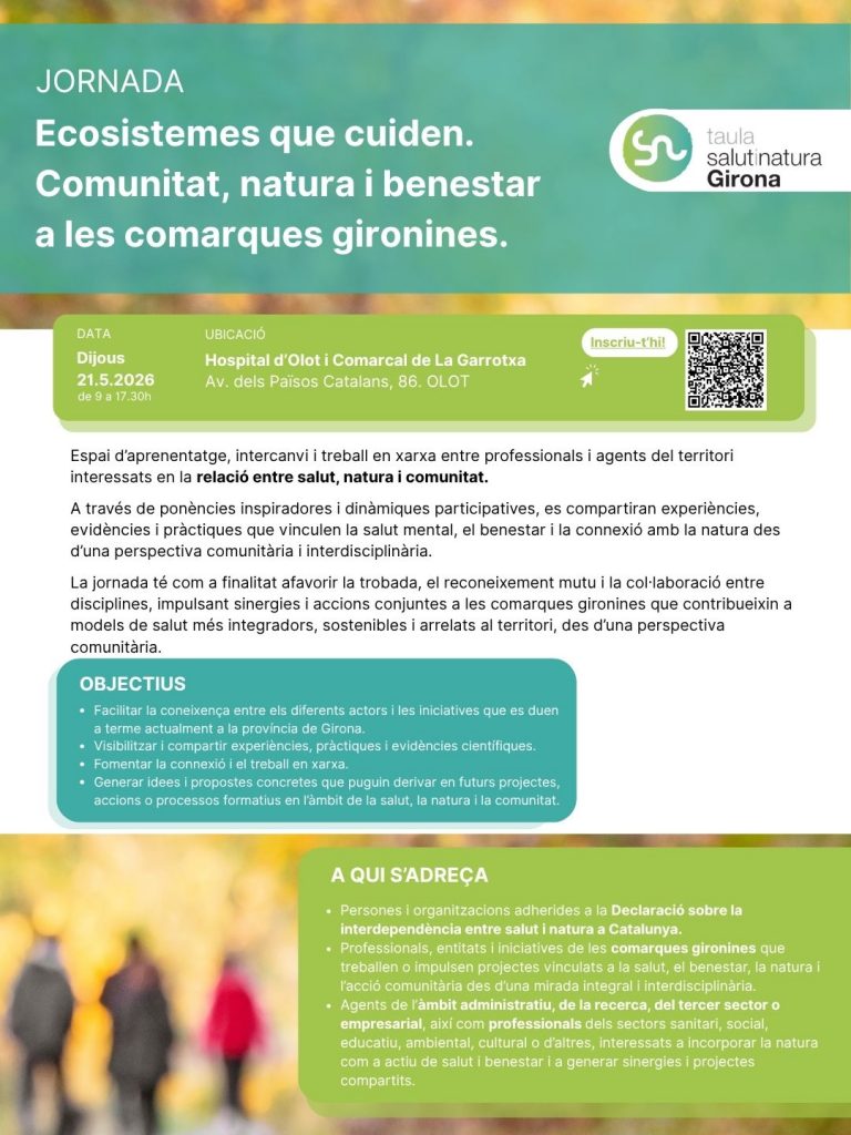 La Taula territorial Salut i Natura de Girona impulsa el 21 de maig a Olot aquesta jornada amb l’objectiu de generar un espai de trobada, aprenentatge i connexió entre professionals i agents del territori que treballen en la intersecció entre salut, natura i comunitat.