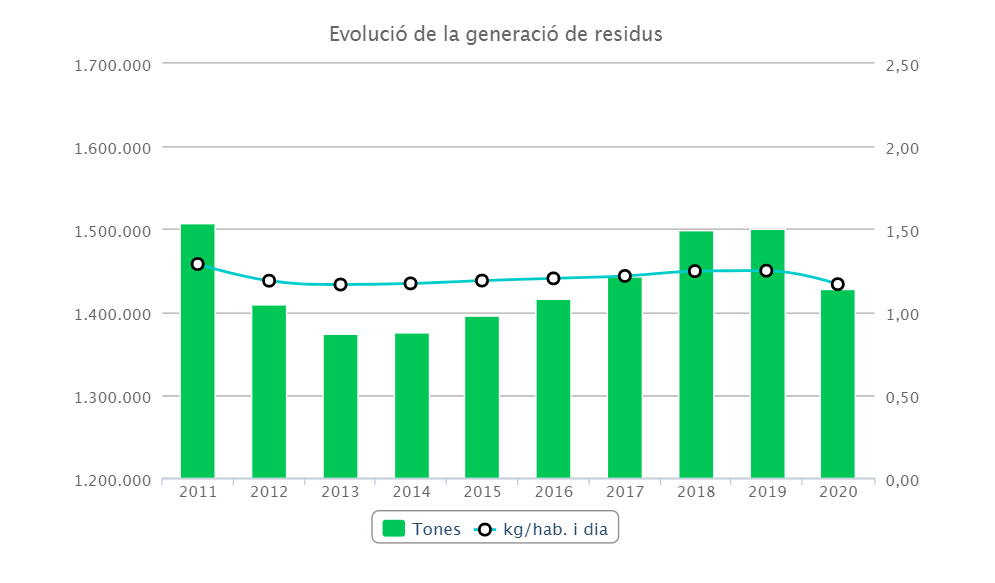 La producció total de residus per habitant a l'àrea metropolitana de Barcelona ha baixat durant el 2020. Així, la generació ha passat de 475 kg de residus per habitant i any el 2019, a 455 kg, en gran part com a conseqüència de la pandèmia. En aquest sentit, és especialment important la disminució en la generació de la fracció resta, que passa de 298 kg hab/any a 281 kg hab/any.