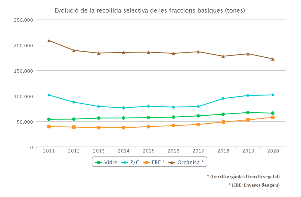La fracció orgànica ha disminuït a conseqüència del gran descens d'activitat d'establiments dedicats a la restauració i l'hostaleria, que disposava de recollida porta a porta en grans municipis com Barcelona.