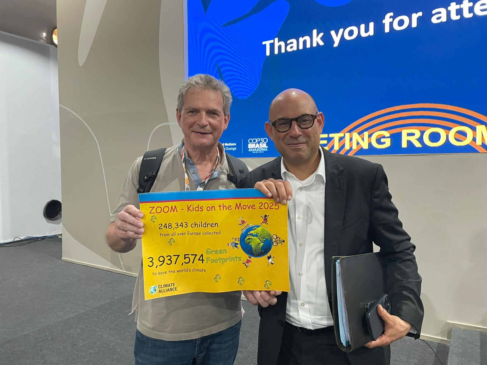 Thomas Brose (Climate Alliance) fa entrega de les “milles verdes” al secretari executiu de la Convenció Marc de les Nacions Unides sobre el Canvi Climàtic (UNFCCC), Simon Stiell.
