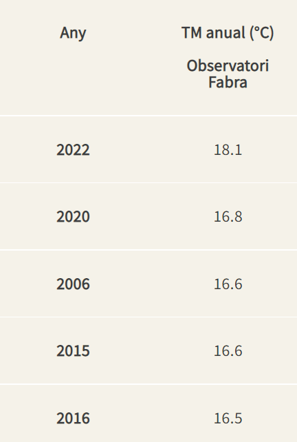 La temperatura mitjana (TM) anual dels cinc anys més càlids als observatoris Ebre i Fabra és la següent: