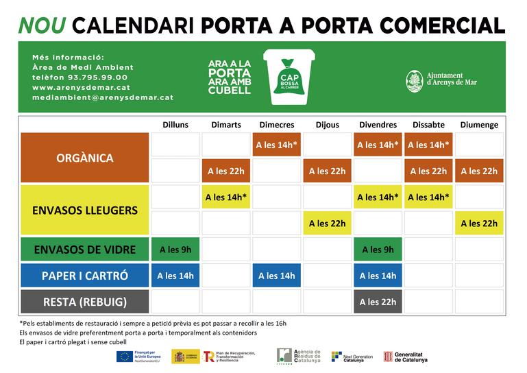 Com queda la recollida pels comerços?  Els establiments disposen d’un calendari setmanal de recollida per a les diferents fraccions de residus, amb indicació de l’hora límit per deixar-les al davant o al costat del portal de cada comerç.