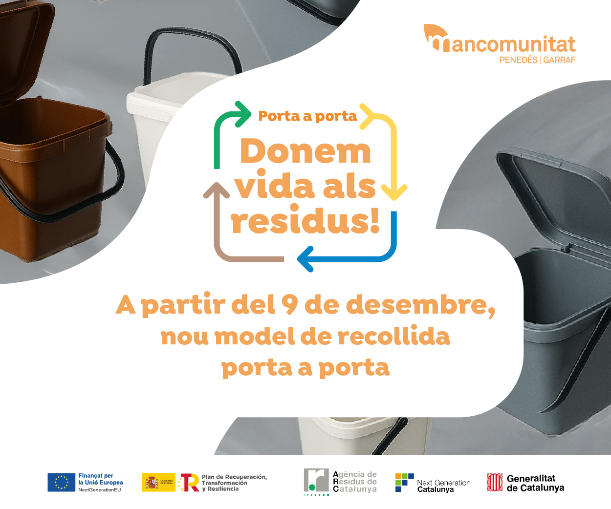 A partir del 9 de desembre, El Pla del Penedès iniciarà el nou model de recollida de residus Porta a Porta. L’objectiu és avançar cap a una millora de la gestió dels residus que es generen al municipi i augmentar els índexs de reciclatge, en línia amb les normatives vigents i amb el repte de l’emergència climàtica.