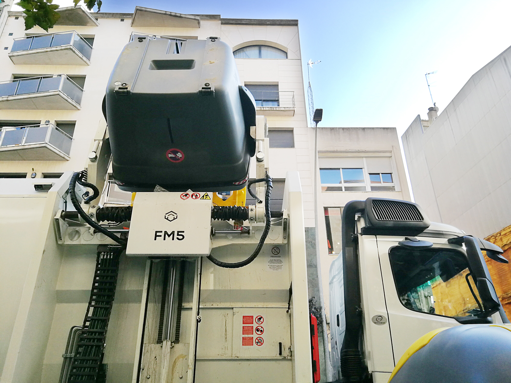 Un camió recollint un contenidor de càrrega lateral dels nous que s'han instal·lat a Granollers | Griselda Escrigas