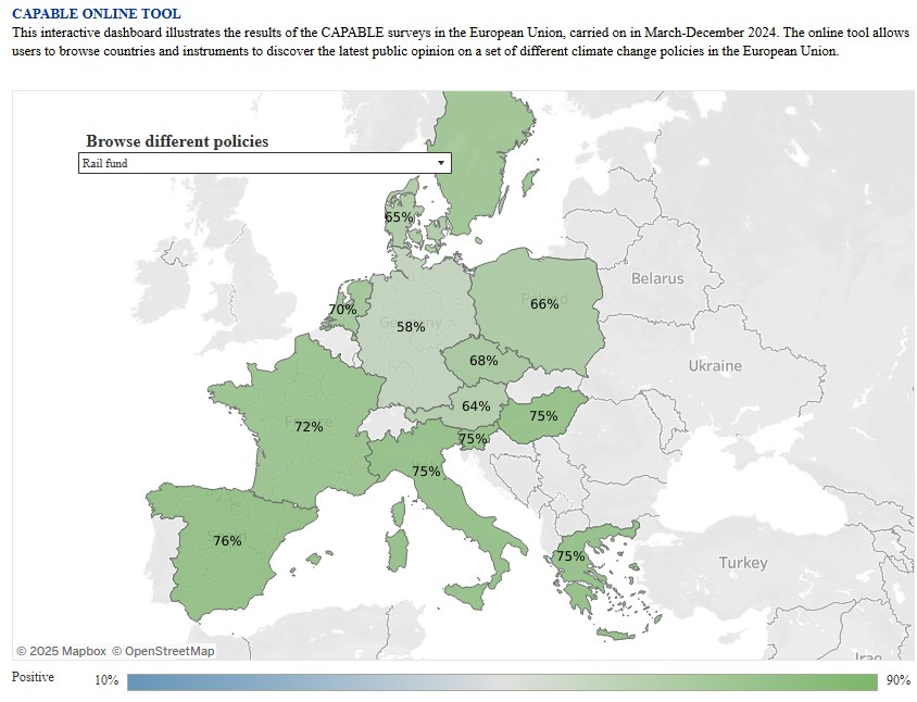 Aquesta nova enquesta, feta en el marc del projecte CAPABLE, finançat per la Unió Europea i en què participa l’Institut de Ciència i Tecnologia Ambientals de la Universitat Autònoma de Barcelona (ICTA-UAB), revela que el 70 % de la població europea donaria suport a la creació d’un fons ferroviari europeu, mentre que el 55 % donaria suport a mesures obligatòries d’aïllament tèrmic dels habitatges i a la prohibició dels avions privats. La creació d’un fons ferroviari europeu permetria ampliar la xarxa ferroviària i reduir el cost dels bitllets de tren a Europa en un 50 %. Així mateix, aplicar mesures d’aïllament als edificis residencials de cara a l’any 2040 permetria complir amb una norma mínima d’eficiència energètica, acompanyant-ho de subvencions governamentals de la meitat del cost per a les llars amb ingressos baixos.