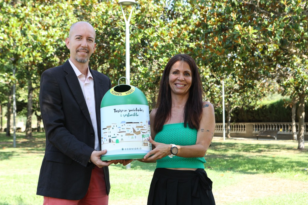 La regidora de Sostenibilitat, Sílvia Vives, i el gerent d’Ecovidrio a Catalunya, Ivan Costa, impulsen la campanya Banderes Verdes de reciclatge d’envasos de vidre.