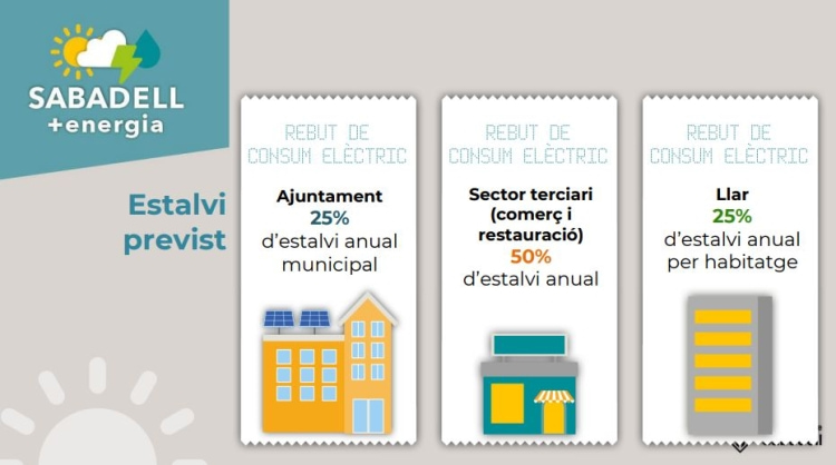 Actualment, els equipaments municipals consumeixen 8.160 MWh anuals, el sector terciari (comerç, restauració i serveis) en consumeix 271.000 MWh i una llar de Sabadell, de mitjana, uns 3,5 MWh l’any. Amb la comunitat energètica en marxa, es preveu un estalvi aproximat del 25% per al conjunt d’equipaments municipals, del 50% per al sector terciari, i del 25% en el rebut elèctric per a cada llar que hi participi.