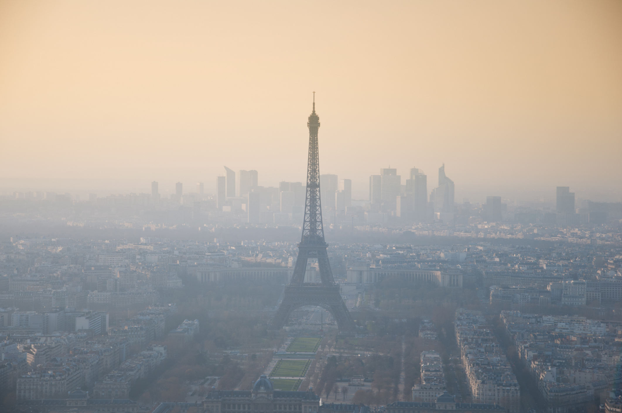 Vista de la Torre Eiffel de París sota una capa de boira i fum.