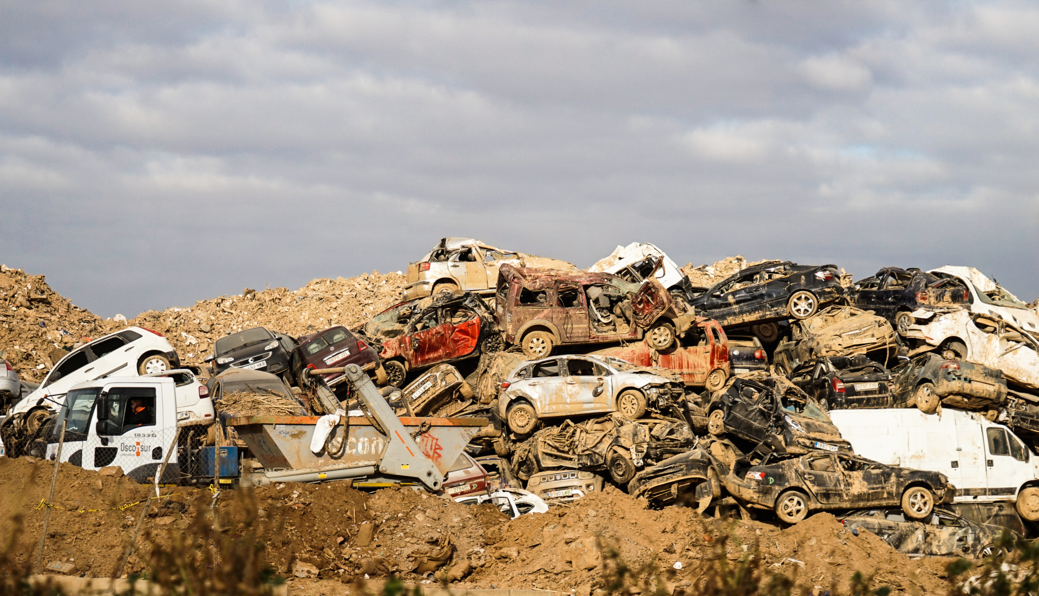Acumulació de cotxes destrossats per les inundacions provocades per la DANA a València l'octubre de 2024.