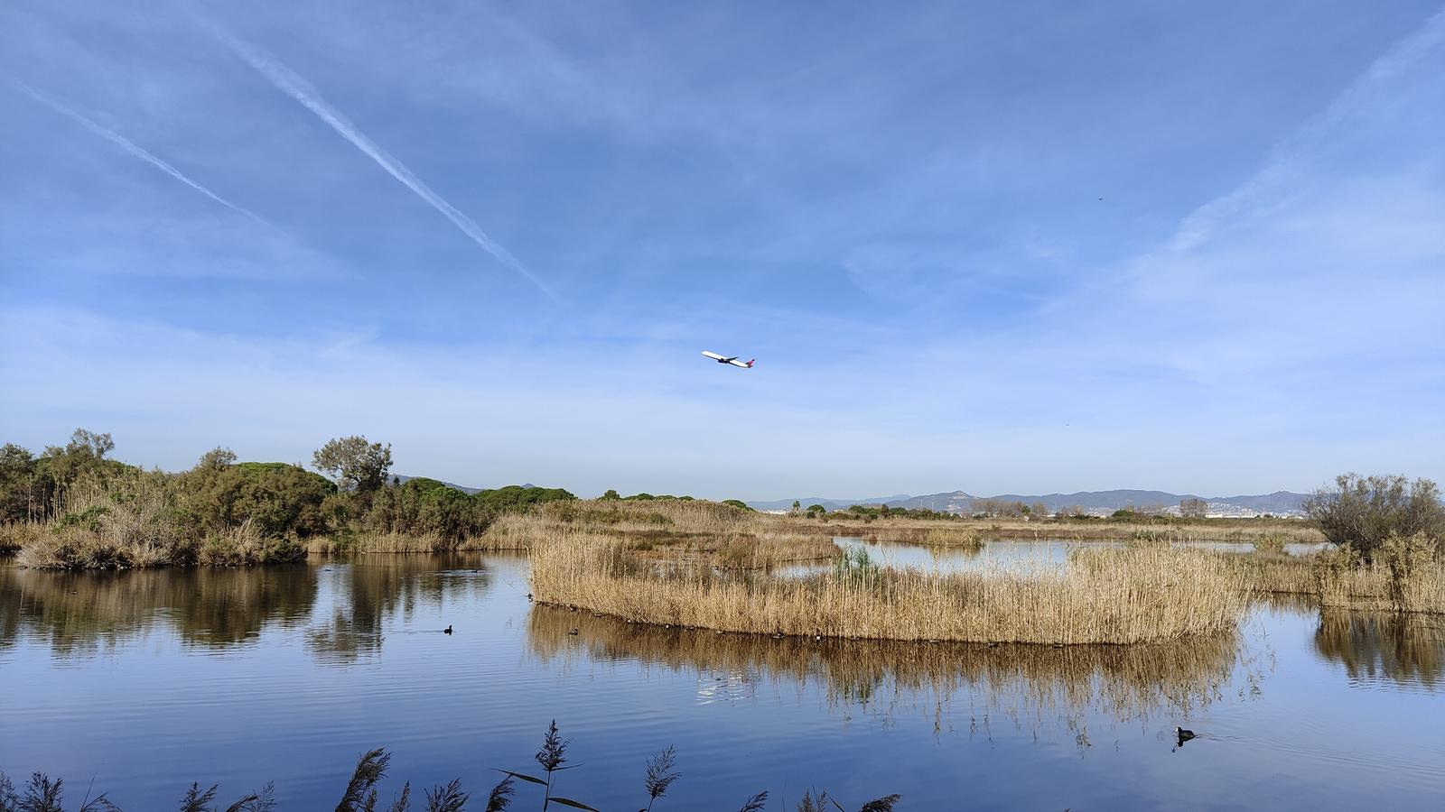 Per exemple, l’aguait de la maresma —al Remolar— és a tocar de la pista d’enlairament. De fet, des de l’interior de l’aguait, mentre observes els flamencs, els estornells i les fredelugues, cada trenta o quaranta segons s’enlaira un avió. I et passa just per damunt. Tant a prop que pots llegir les lletres de la companyia, veure els cargols del fuselatge i potser inclús saludar al pilot. El soroll és eixordador, i la visió francament impressionant.