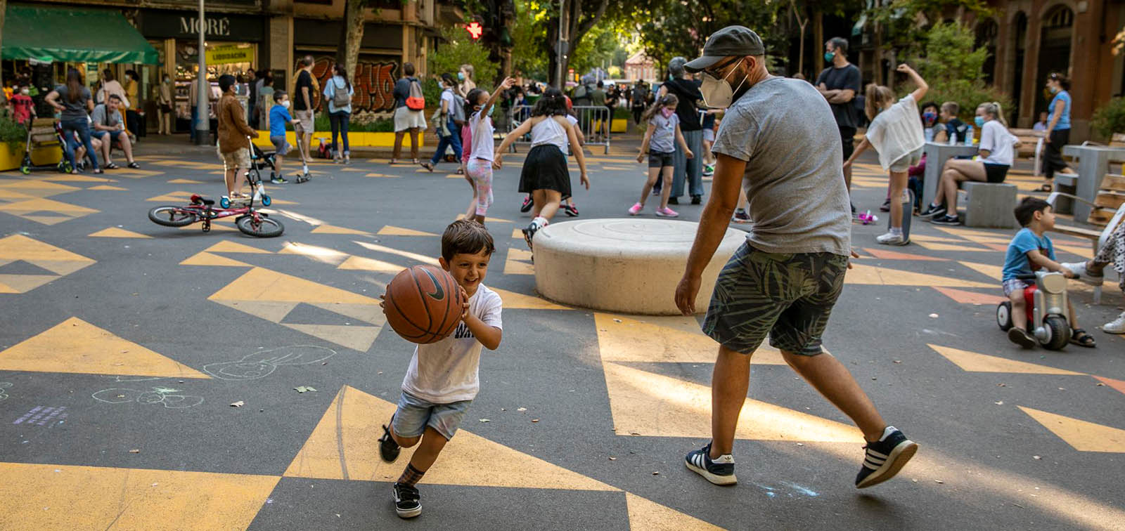 Foto: Edu Bayer / Ajuntament de Barcelona - Nens i famílies juguen a la zona pacificada de la superilla del barri de Sant Antoni, Barcelona.
