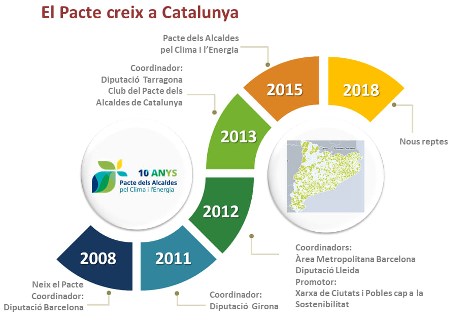 Ja son 730 ciutats i pobles d'arreu de Catalunya les que s’han adherit en els darrers 10 anys a la corrent principal del moviment europeu que involucra les Autoritats Locals i la seva ciutadania en la lluita contra el canvi climàtic. Aquesta iniciativa renovada defineix els nous compromisos i la visió compartida per abordar reptes interconnectats: la mitigació del canvi climàtic, l’adaptació i l’energia sostenible.