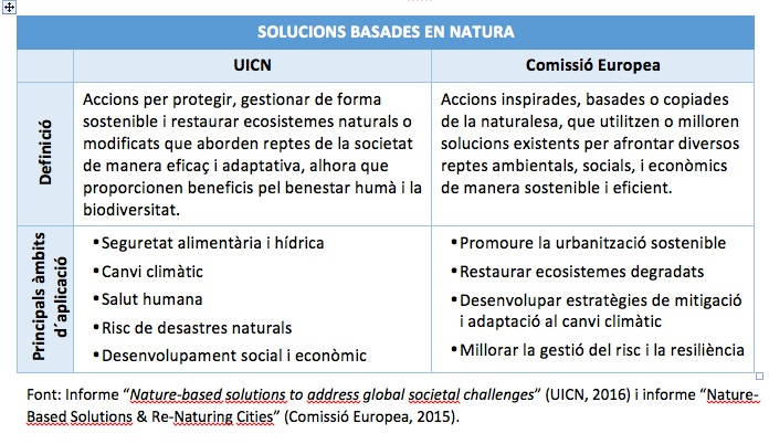 Ambdues organitzacions defineixen el concepte de SbN de manera similar i identifiquen àmbits o objectius d’aplicació semblants (veure Taula 1). No obstant, la definició de la Comissió Europea és més àmplia ja que, a priori, inclou solucions només inspirades o copiades de la natura, com ara les aplicacions biomimètiques (veure aquest document). Així mateix, l’enfocament de la Comissió Europea està més centrat en l’àmbit urbà i la creació de nous ecosistemes, mentre que el de l’UICN es basa més en els principis de gestió i conservació dels ecosistemes existents a una escala de paisatge.