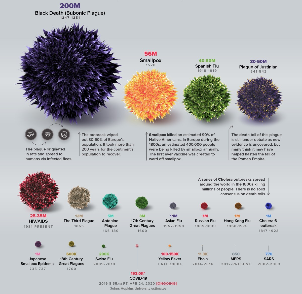 Contextualització històrica de la mortalitat causada per la CoVID-19. Foto: Visualizing the History of Pandemics